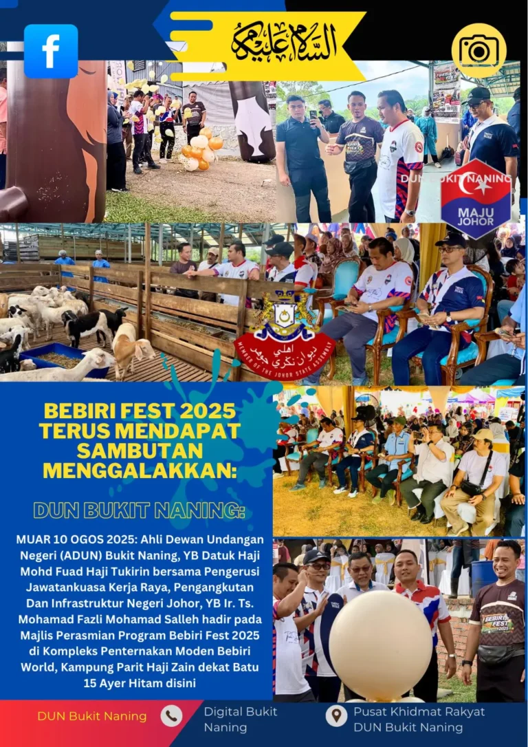Terdahulu, Ahli Dewan Undangan Negeri (ADUN) Bukit Naning, YB Datuk Haji Mohd Fuad Haji Tukirin bersama Pengerusi Jawatankuasa Kerja Raya, Pengangkutan Dan Infrastruktur Negeri Johor, YB Ir. Ts. Mohamad Fazli Mohamad Salleh hadir pada Majlis Perasmian Program Bebiri Fest 2025 di Kompleks Penternakan Moden Bebiri World, Kampung Parit Haji Zain dekat Batu 15 Ayer Hitam disini.